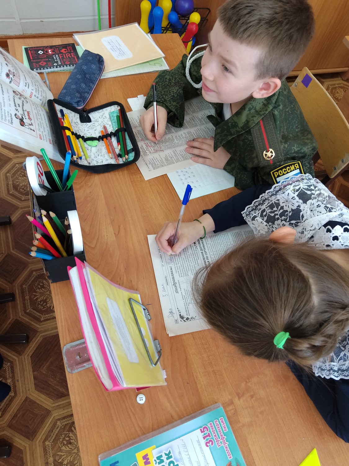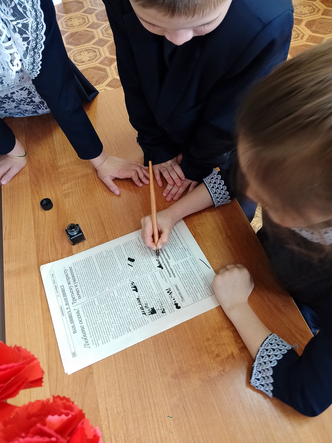 Накануне праздника Дня Победы ученики 1 класса узнали о том, как дети учились во время войны, в каких тетрадях писали, чем писали. На уроке русского языка дети сами попробовали писать чернилами  в тетрадях, сделанных из газет.